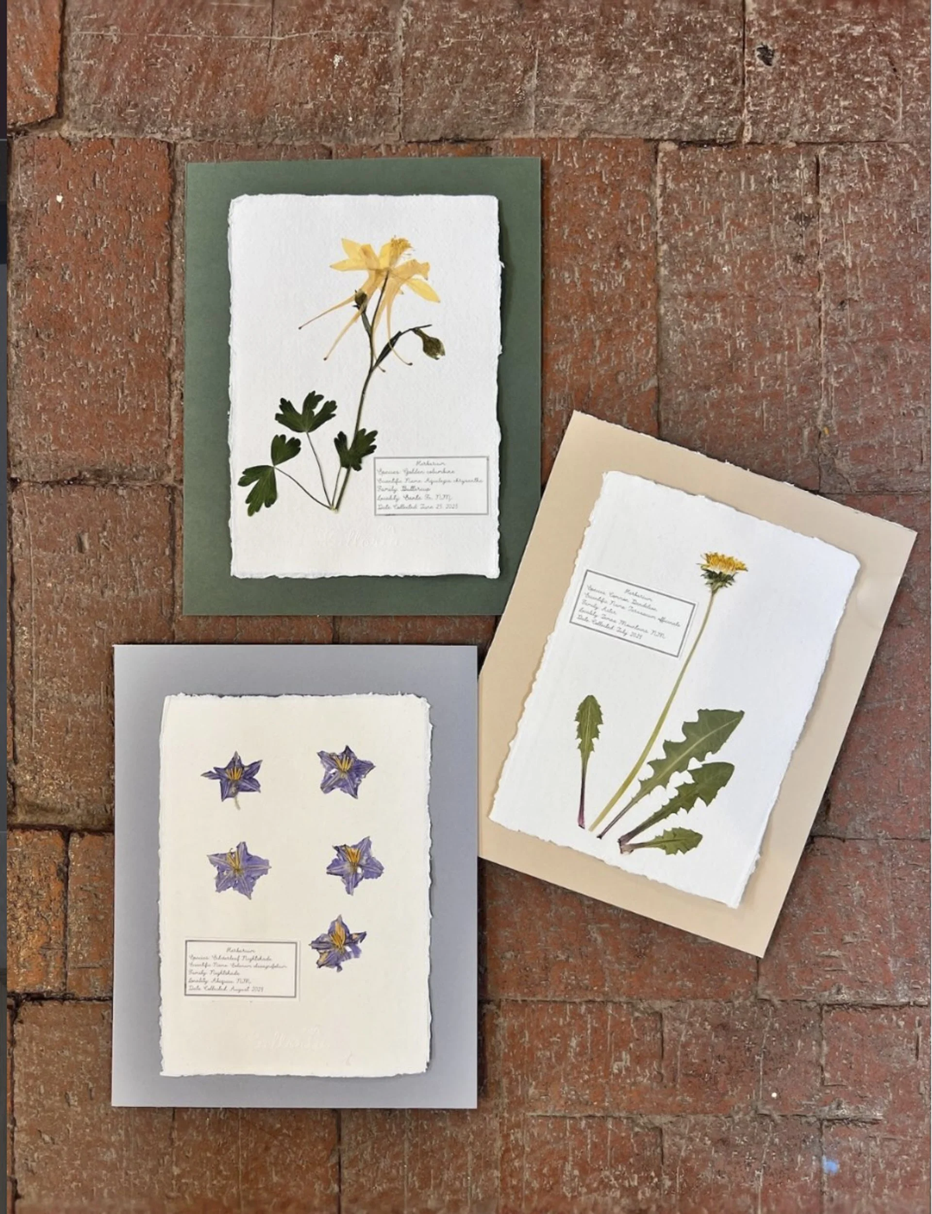 Four or more distinct flower species, each mounted individually on handmade watercolor paper with a plant identification label and framed together. These works allow each flower to remain distinct while forming a cohesive whole.