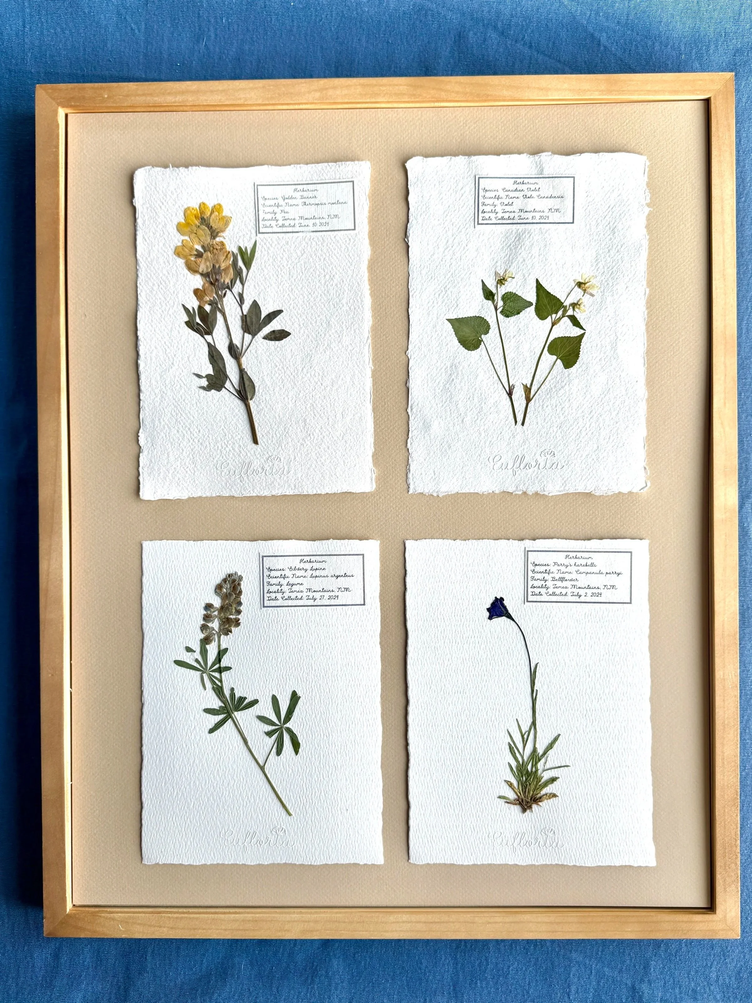 Four or more distinct flower species, each mounted individually on handmade watercolor paper with a plant identification label and framed together. These works allow each flower to remain distinct while forming a cohesive whole.