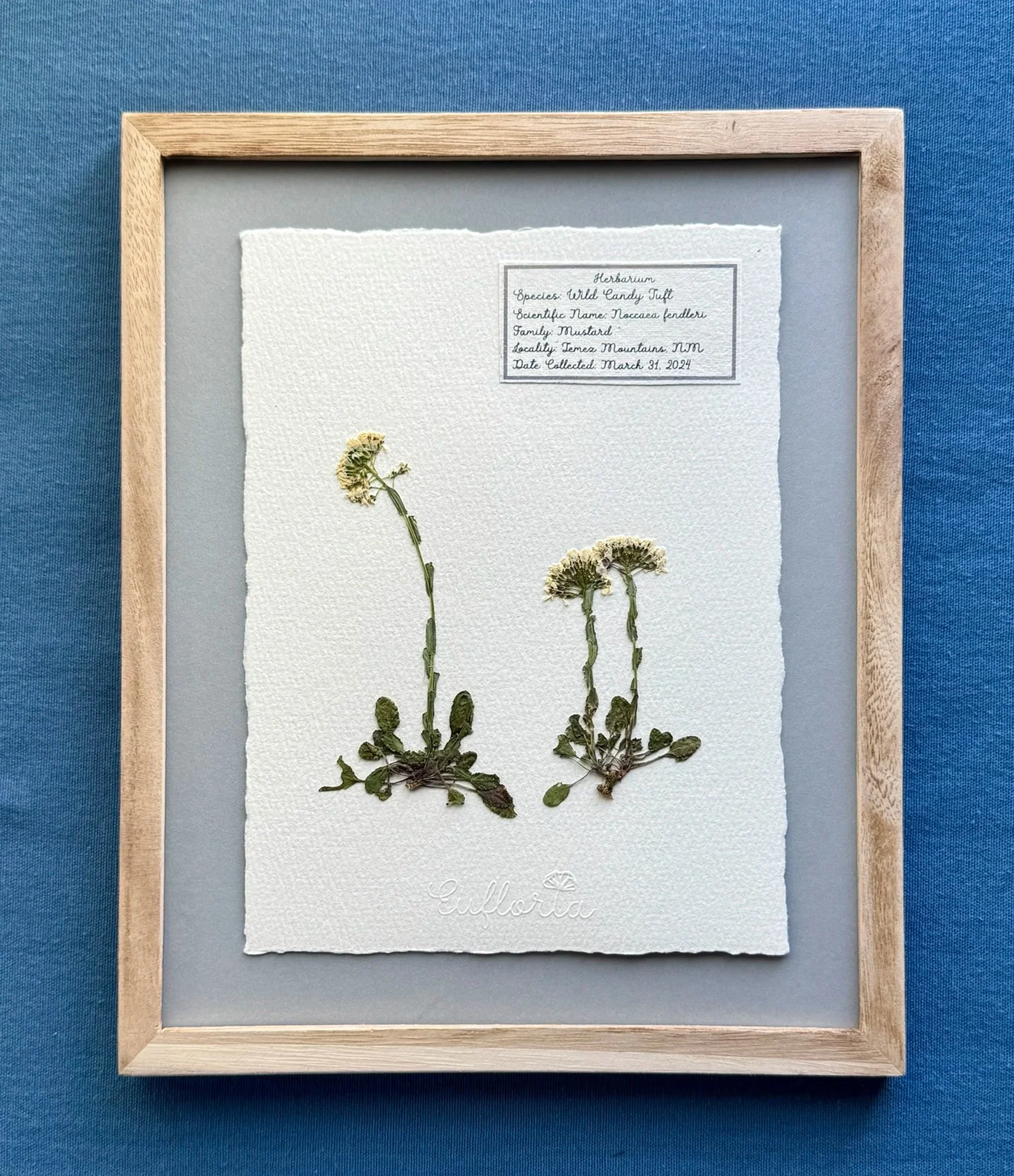 A single flower species mounted on A4 handmade watercolor paper with plant identification label, presented in its own 11×14 frame.