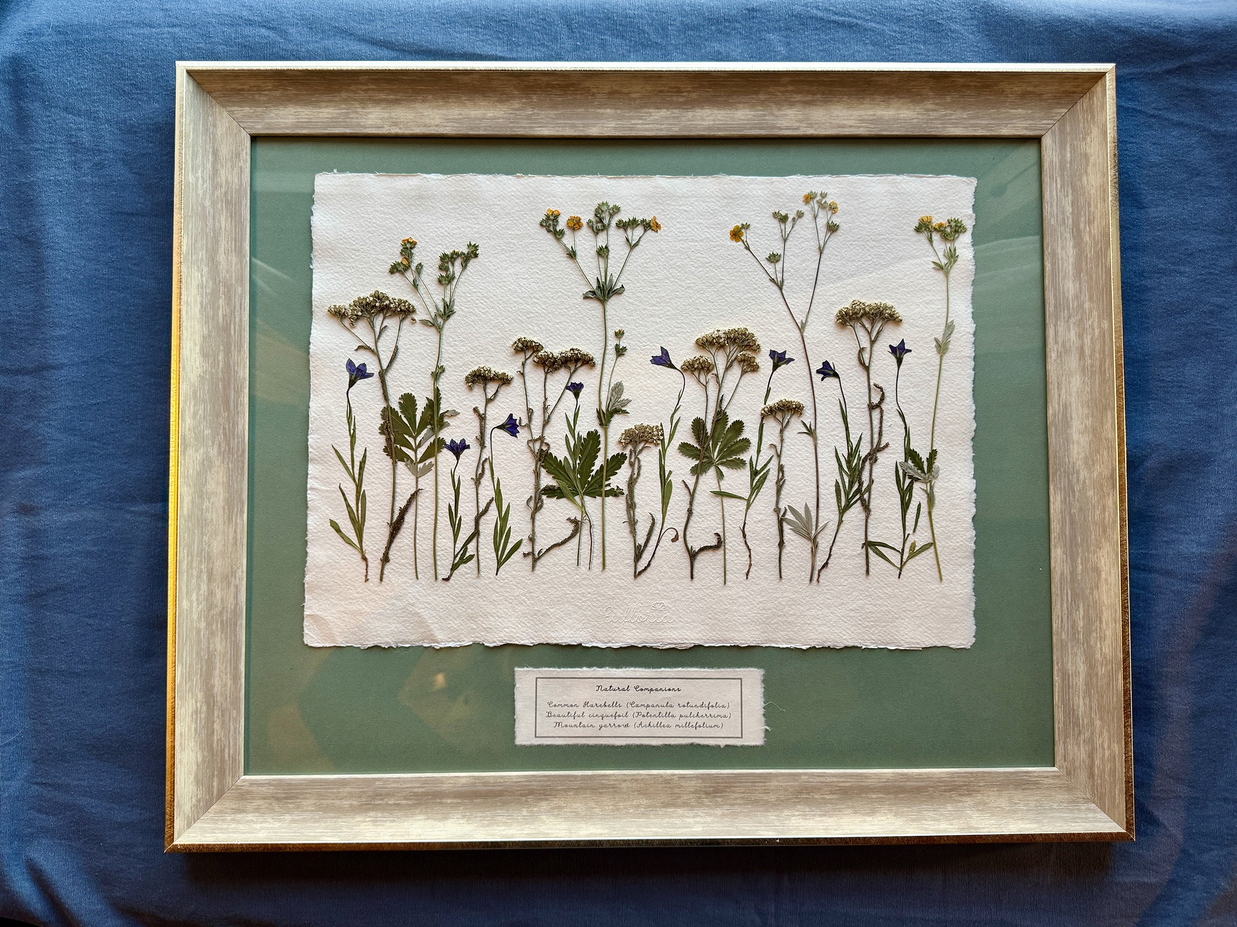 Natural Companions is a botanical art collection inspired by the plant relationships I observe in fields, forests, and gardens—species that return to the same places each season, growing alongside one another and shaping a shared habitat. After gathering the plants, I photograph them in my studio against a white background to highlight their forms and companionship; the photographs become the art prints, while the original works are created from the pressed plants themselves.